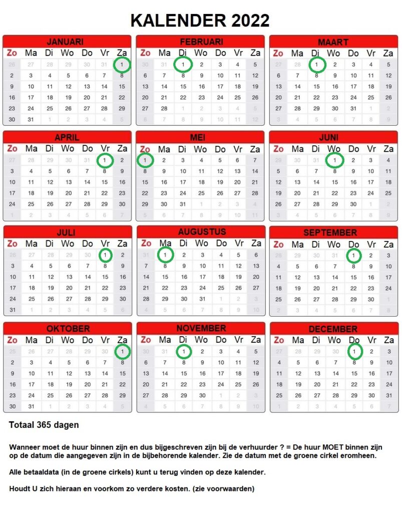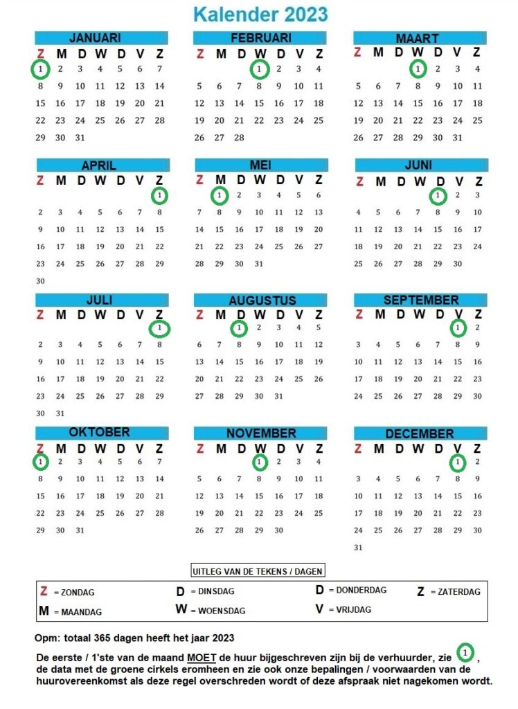Op tijd de huur betalen (naast het juiste volledige bedrag) is van belang, zie daarom de kalender met daarop alle “DATA” waarop U uiterlijk de huur moet betalen !