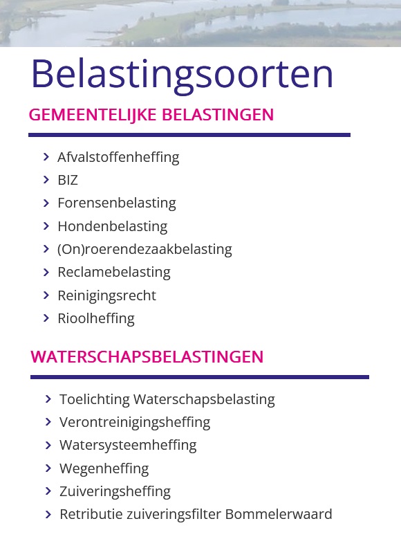 Naast de gemeentelijke belastingen bestaan er ook nog de waterschapsbelastingen, deze worden door de organisatie BSR verstuurd, zie ook deze lijst met diverse belastingsoorten.